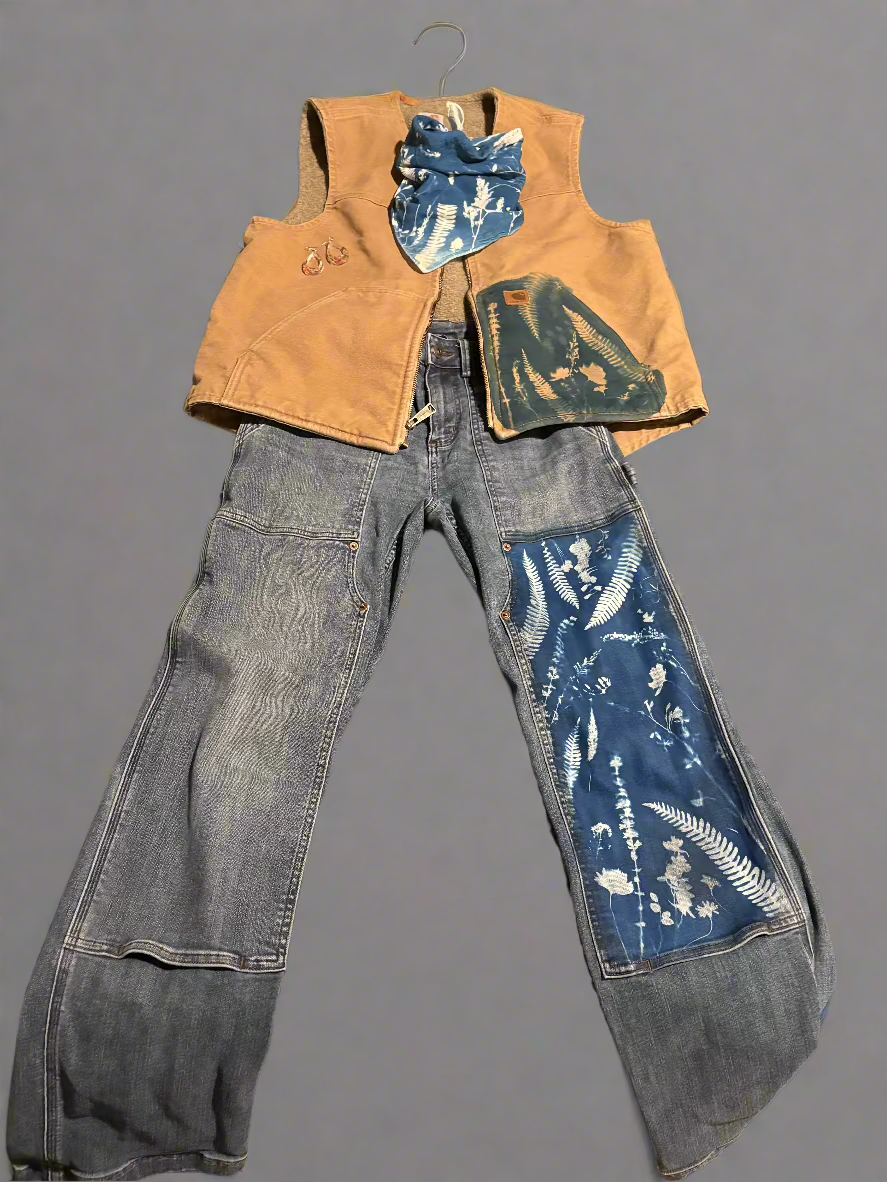 Upcycled clothing, accessories, and prints made using a photography style called 'cyanotype'.