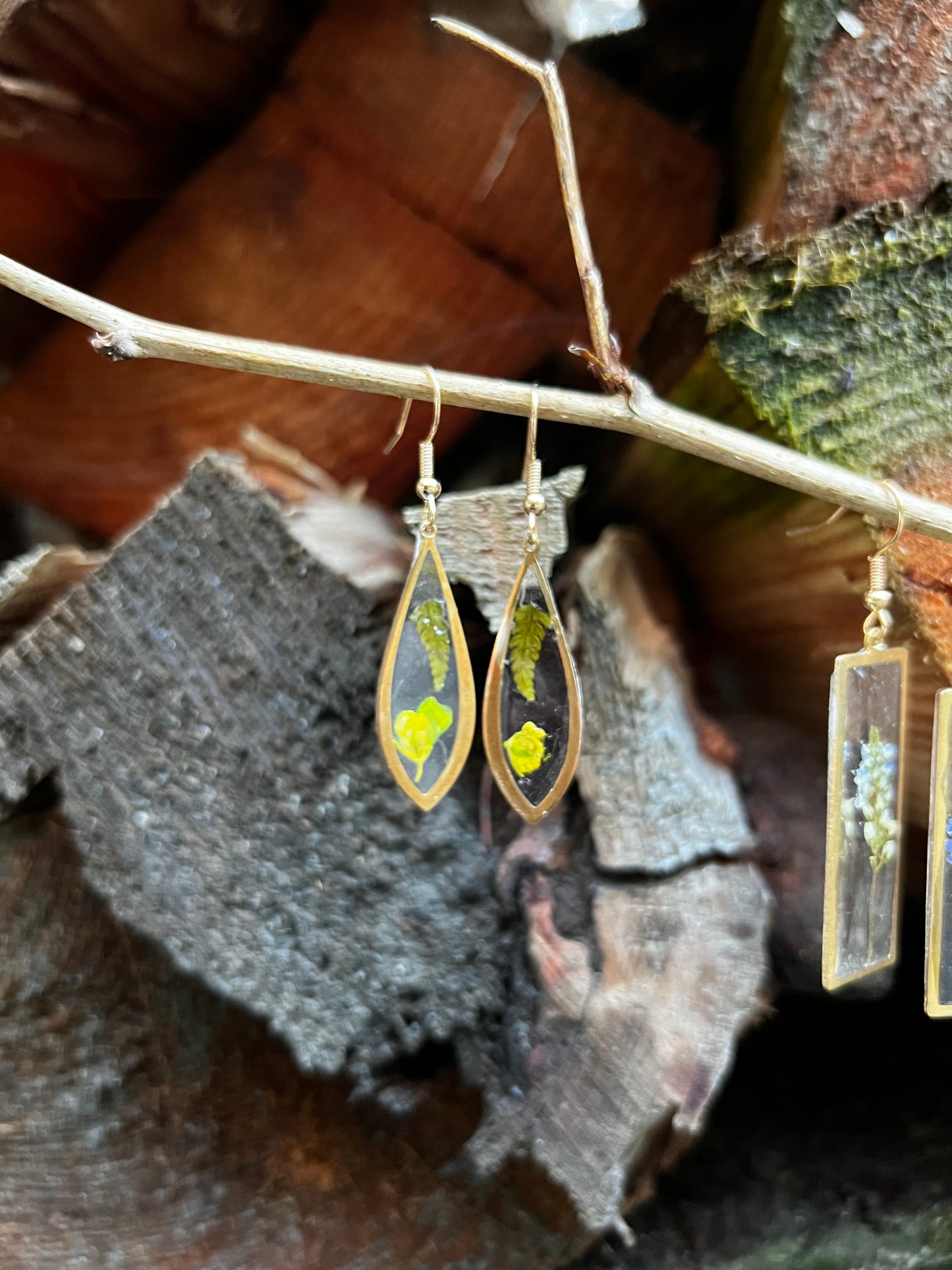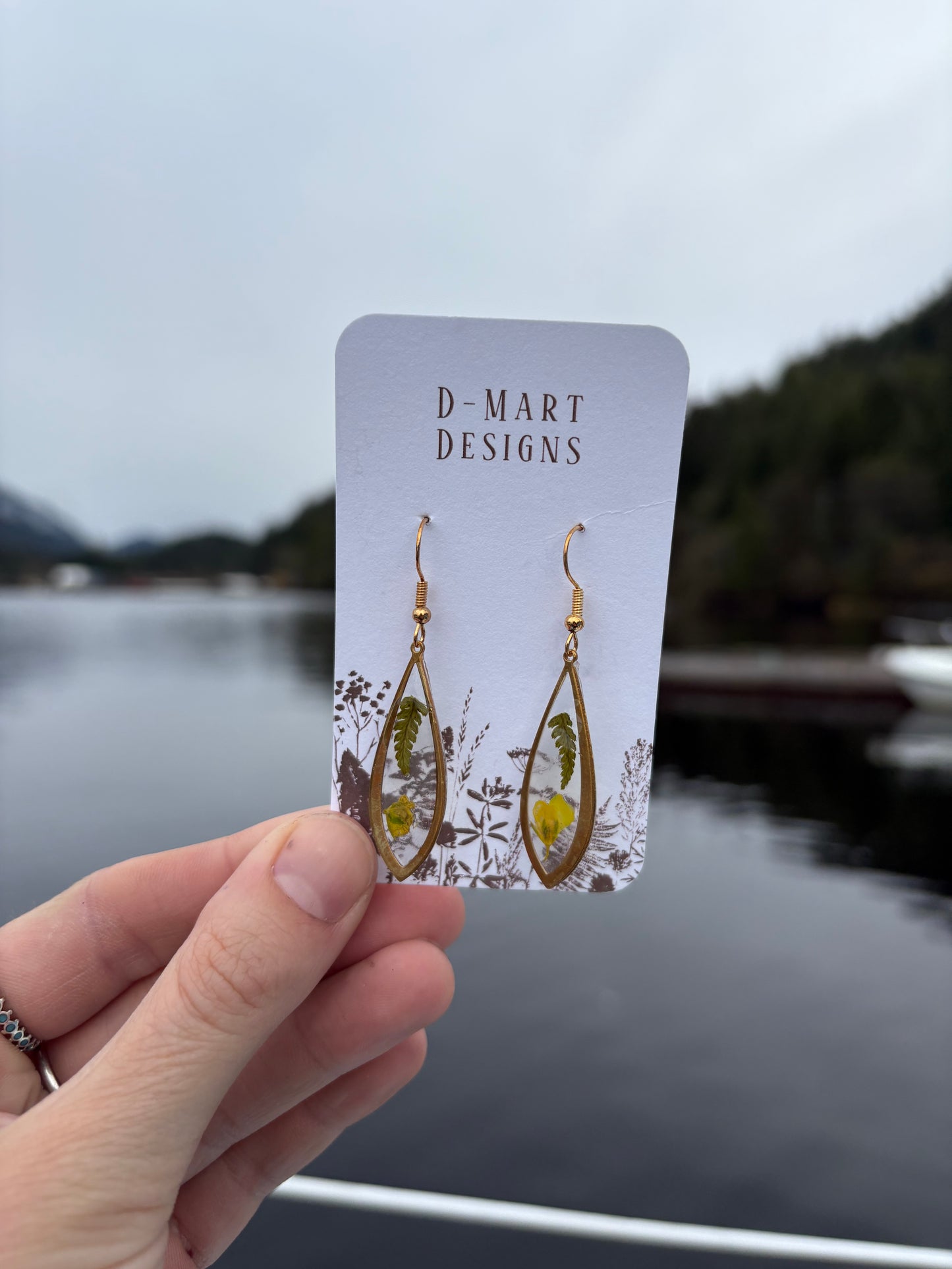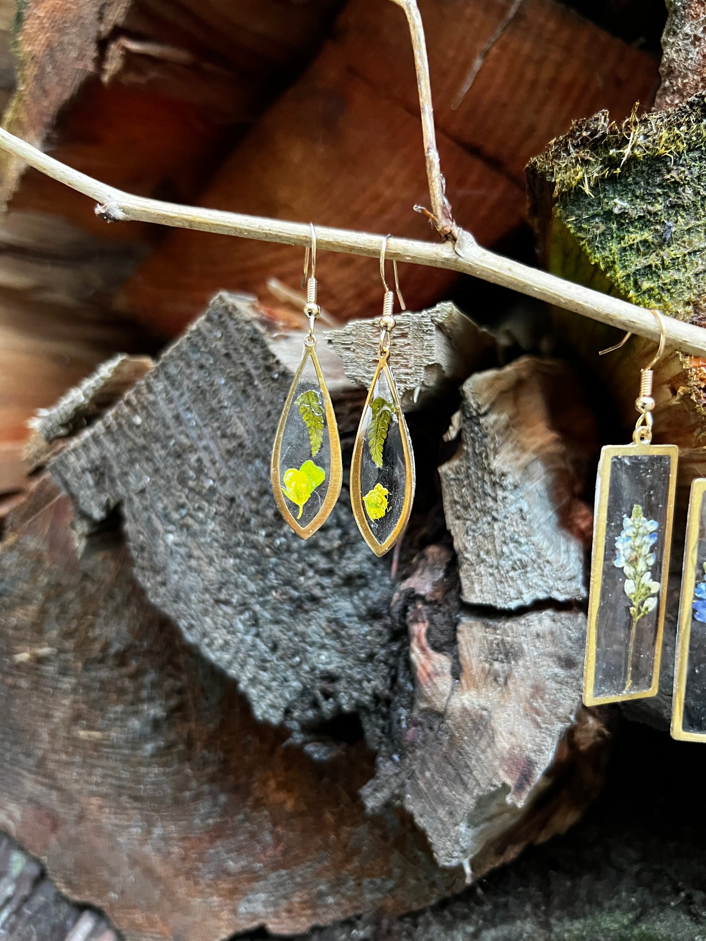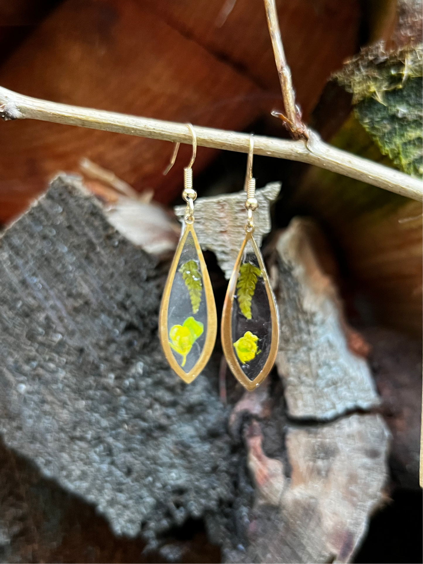 Western Oak Ferns handpicked in southeast Alaska with yellow wildflowers. Metal is bronze in color, and hooks are hypoallergenic/ Nickel free.