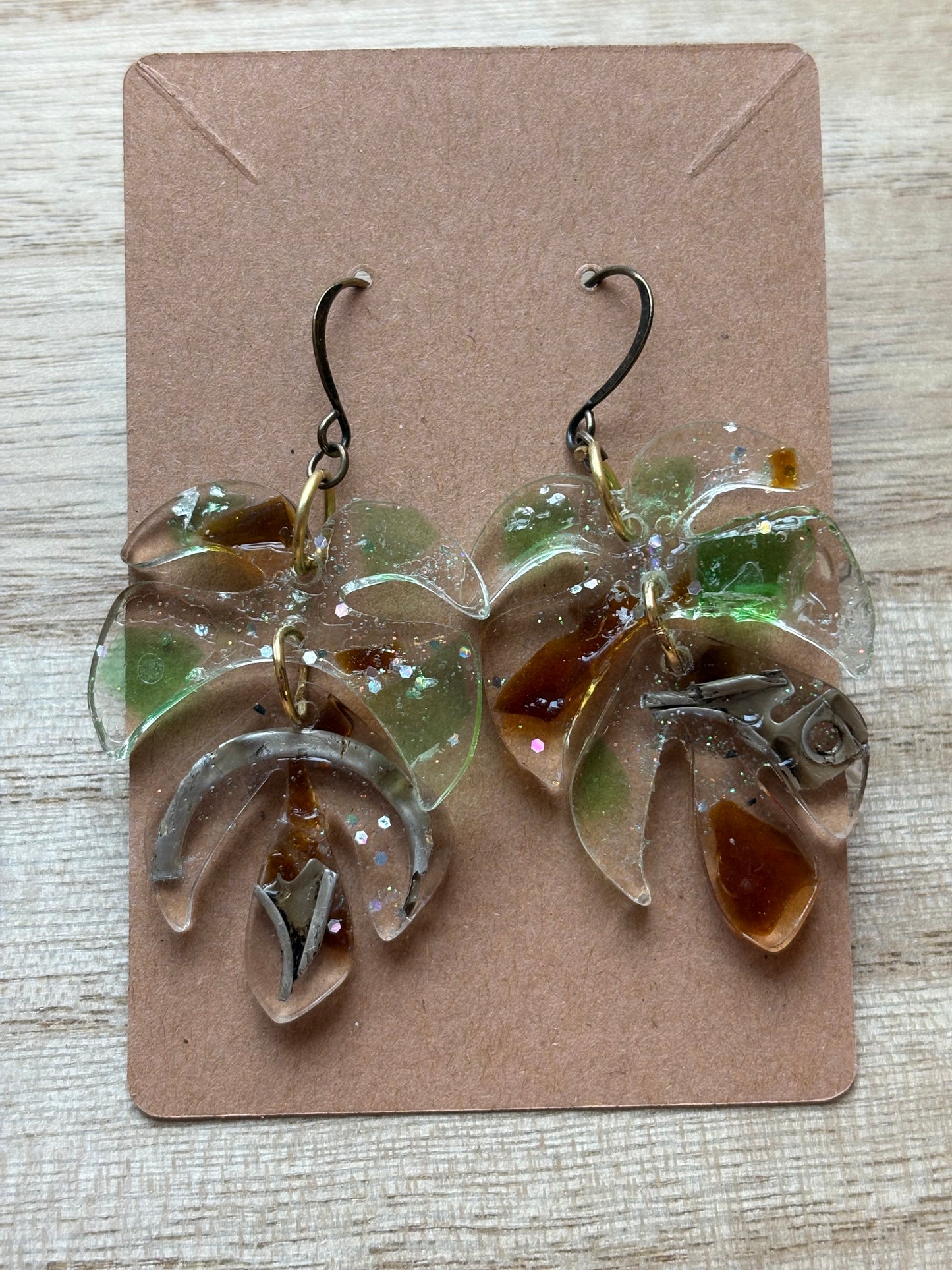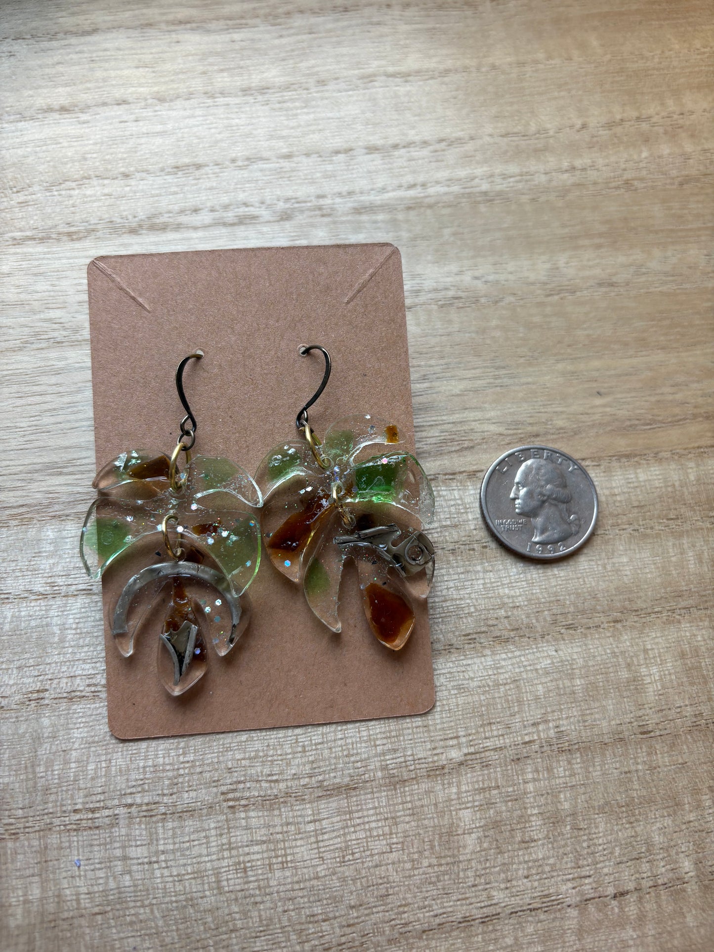 Multi colored sea glass and Monstera shaped sea glass earrings. This pair of earrings has pieces of a can top inside of it found on Alaska’s beaches. And glitter…. Ya know, to offset the whole trash thing.