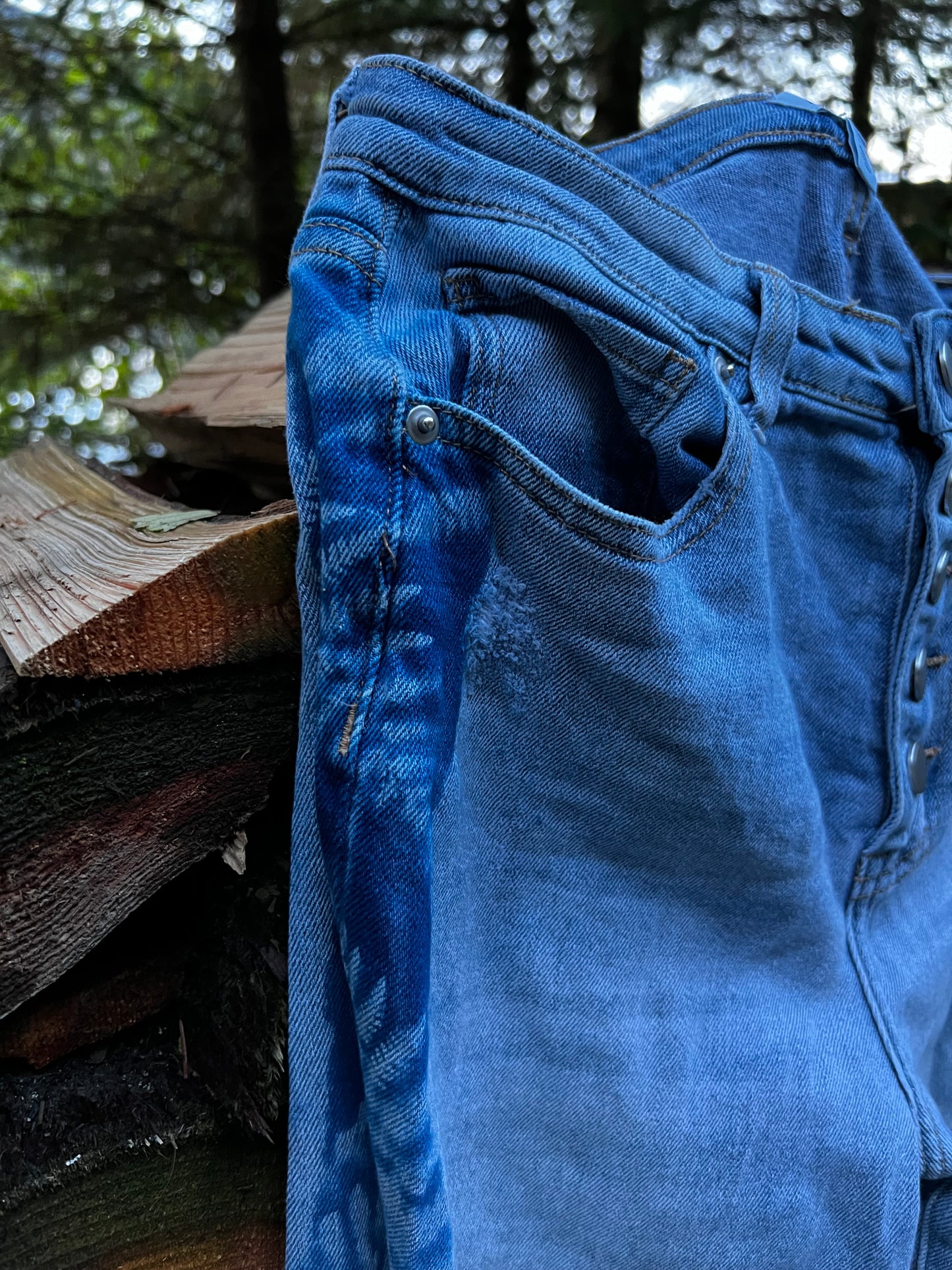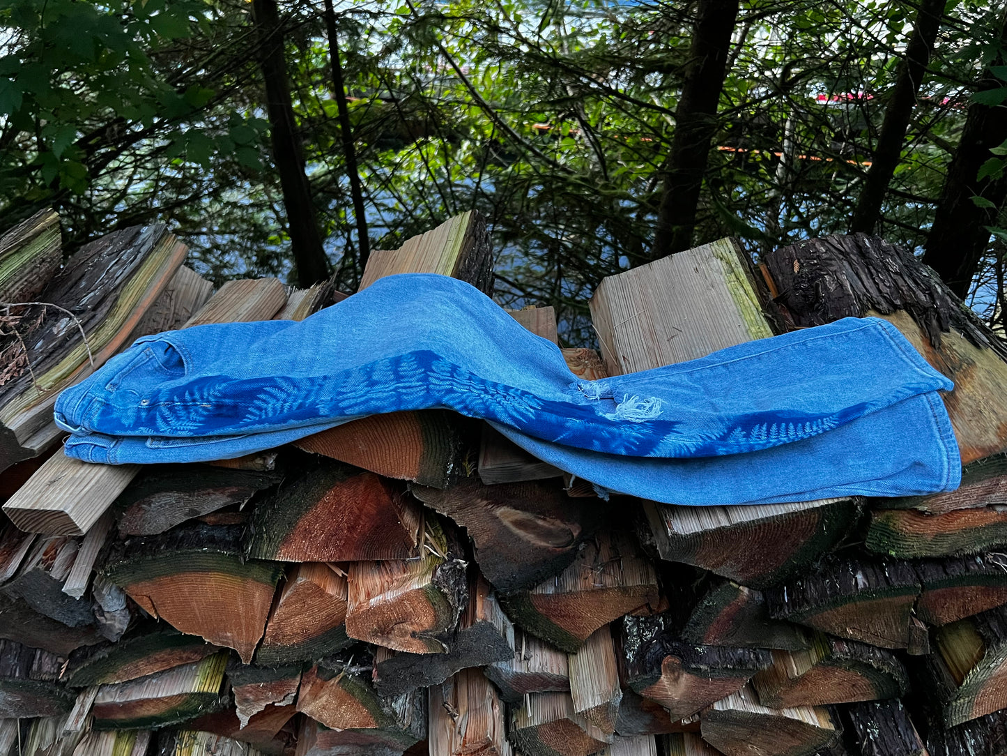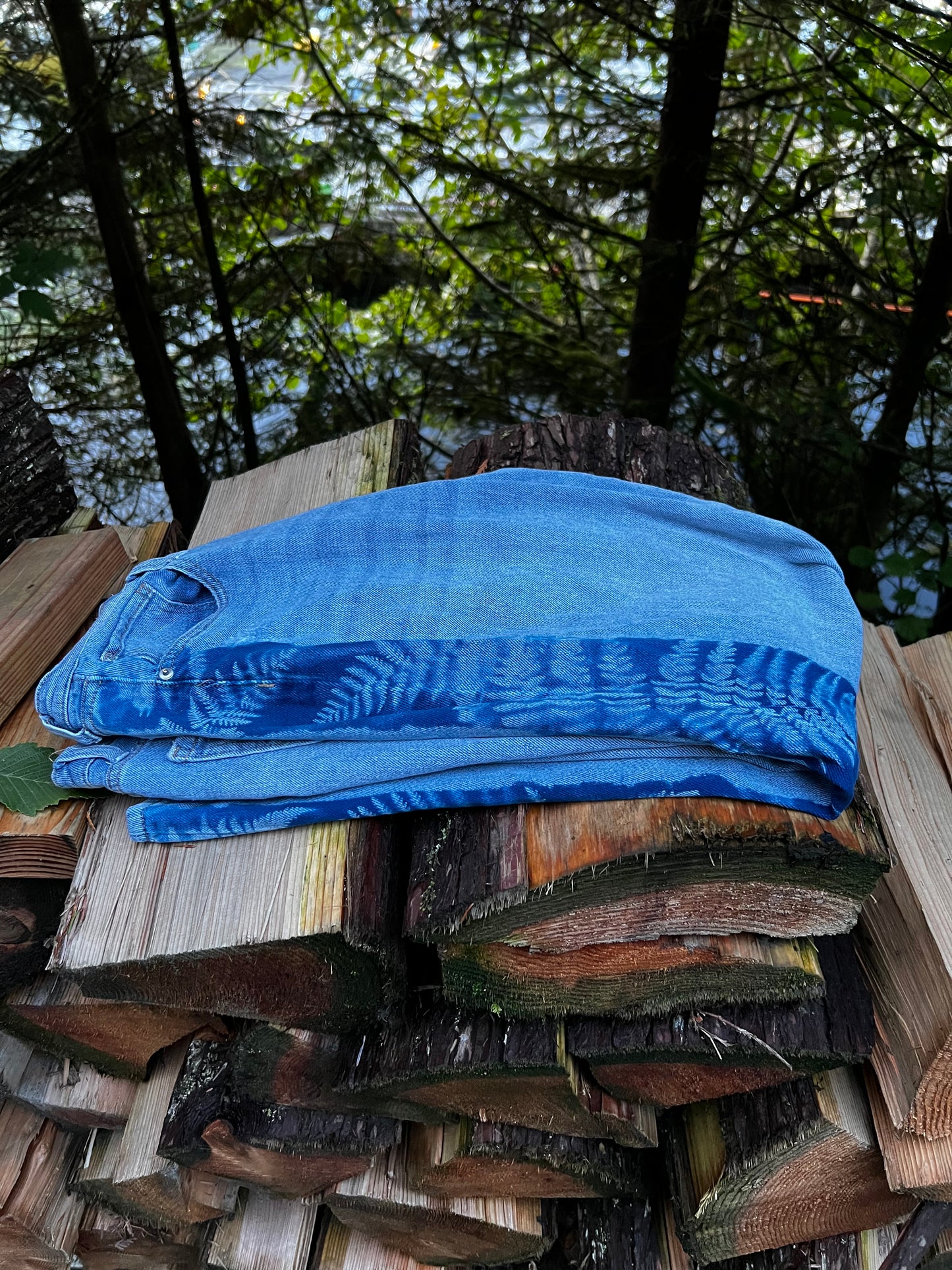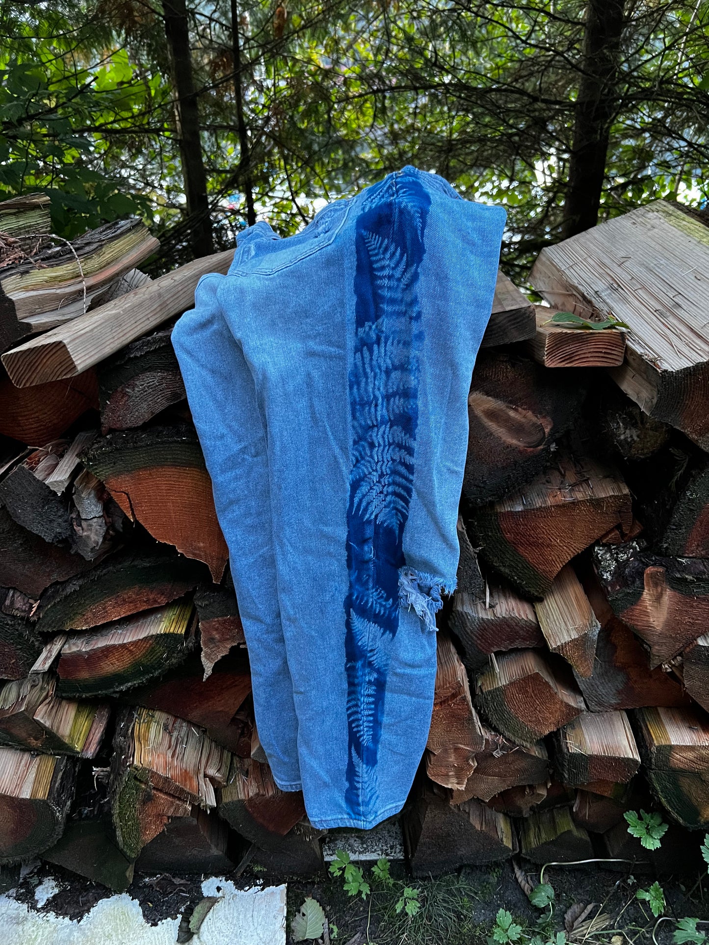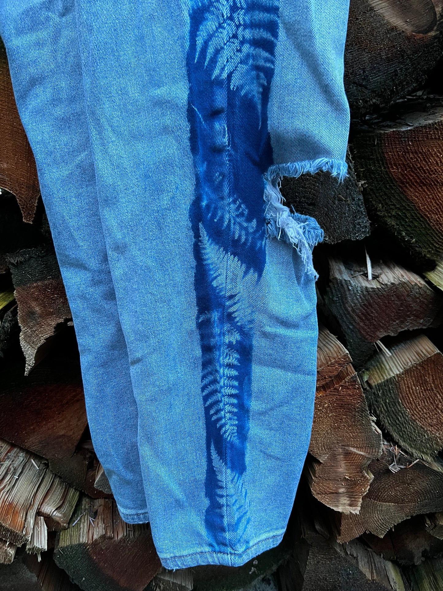 Abound brand denim jeans size 27. side strip of Cyanotype photographed ferns. Holes in both knees. Small rip along the waistline.