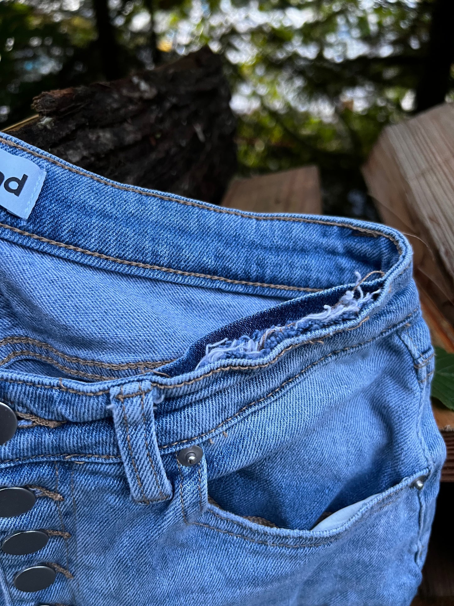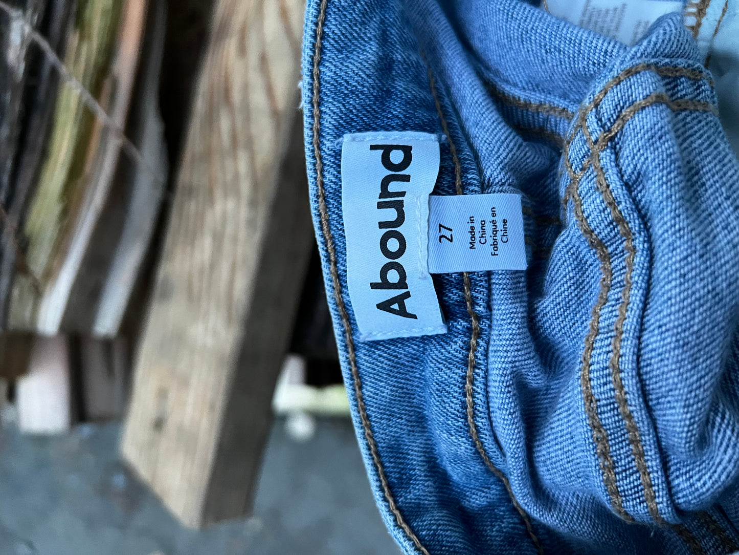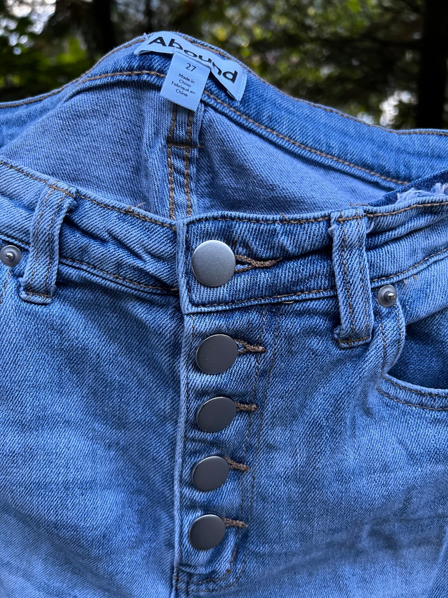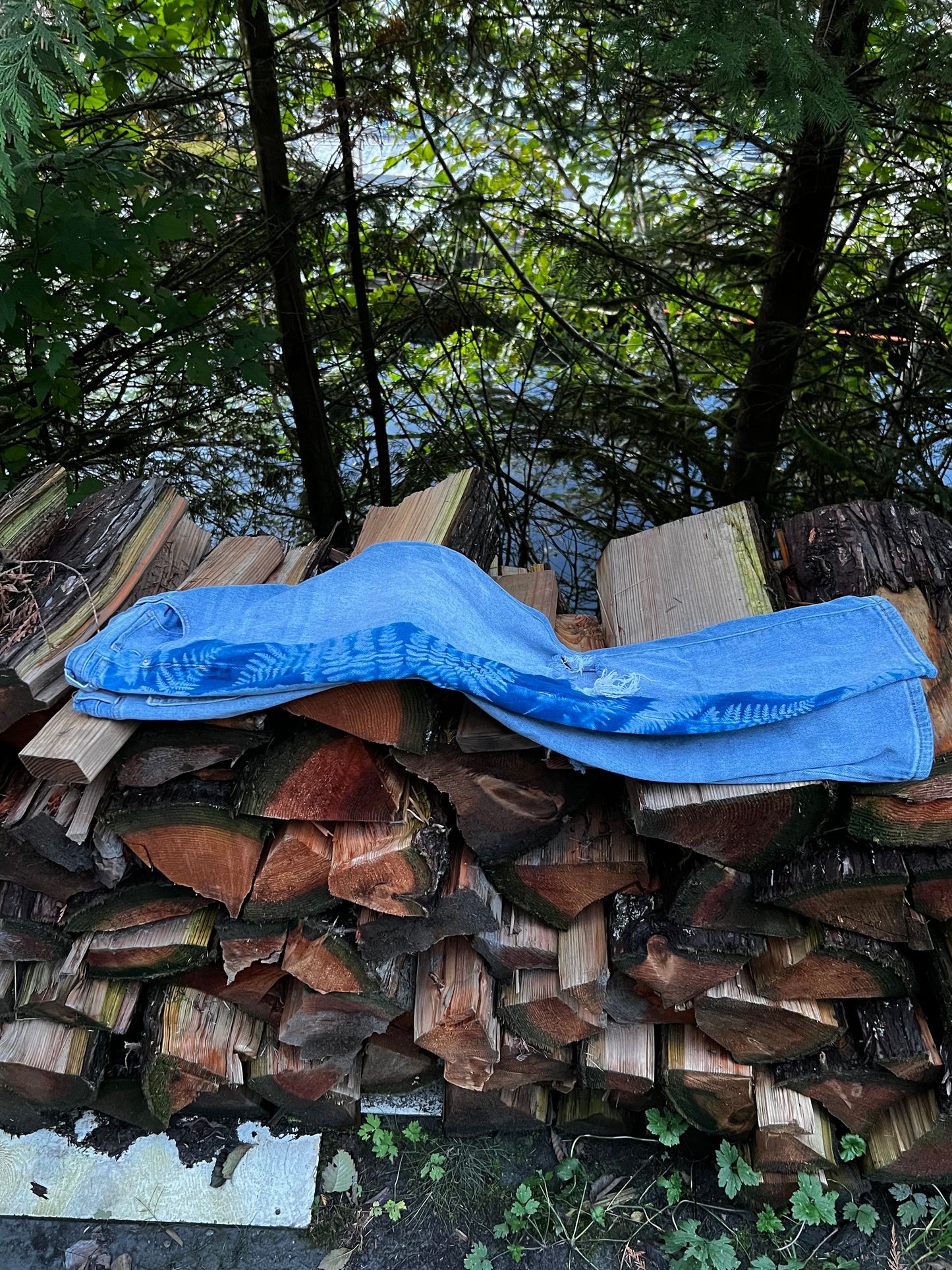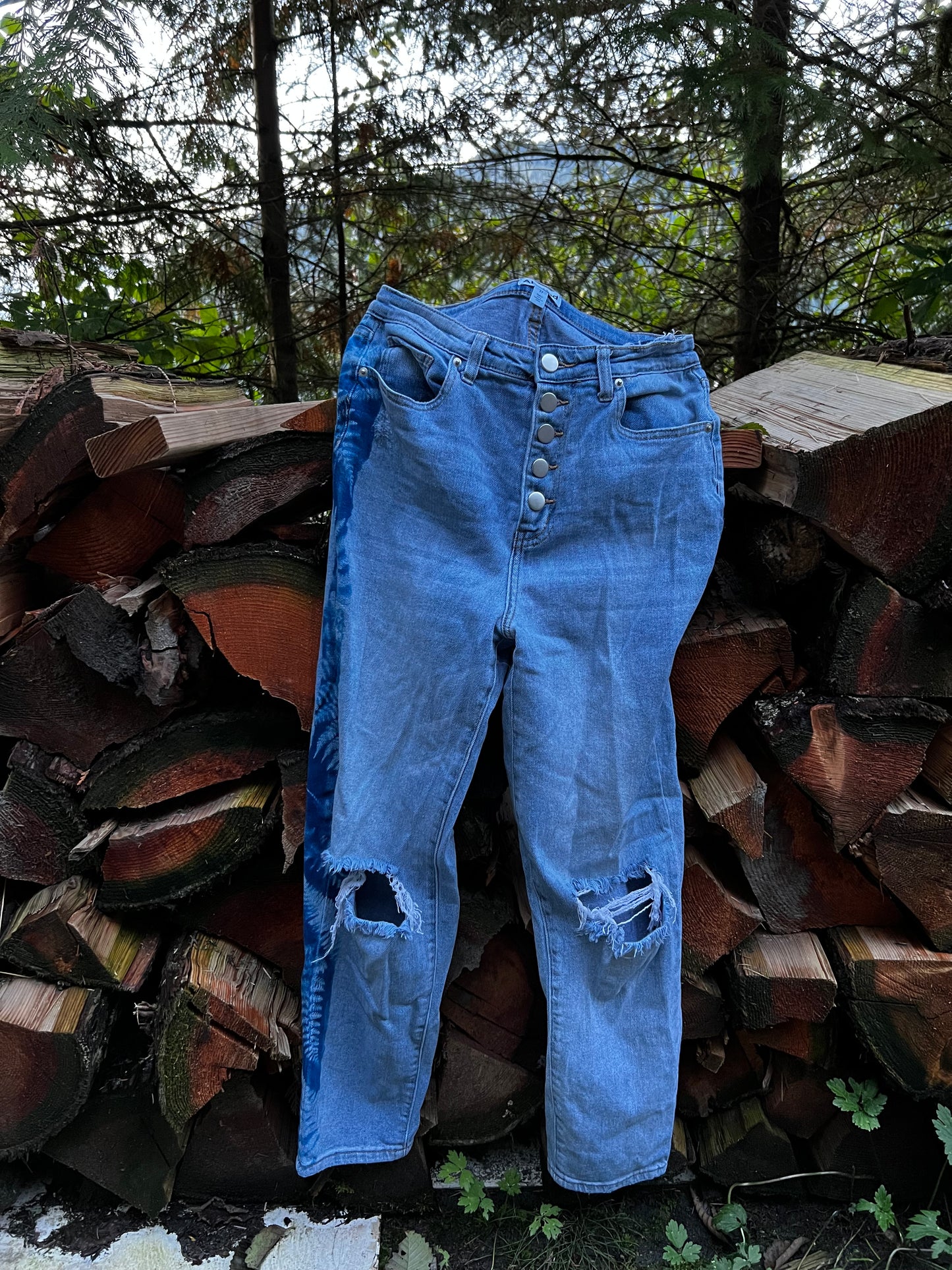 Abound brand denim jeans size 27. side strip of Cyanotype photographed ferns. Holes in both knees. Small rip along the waistline.