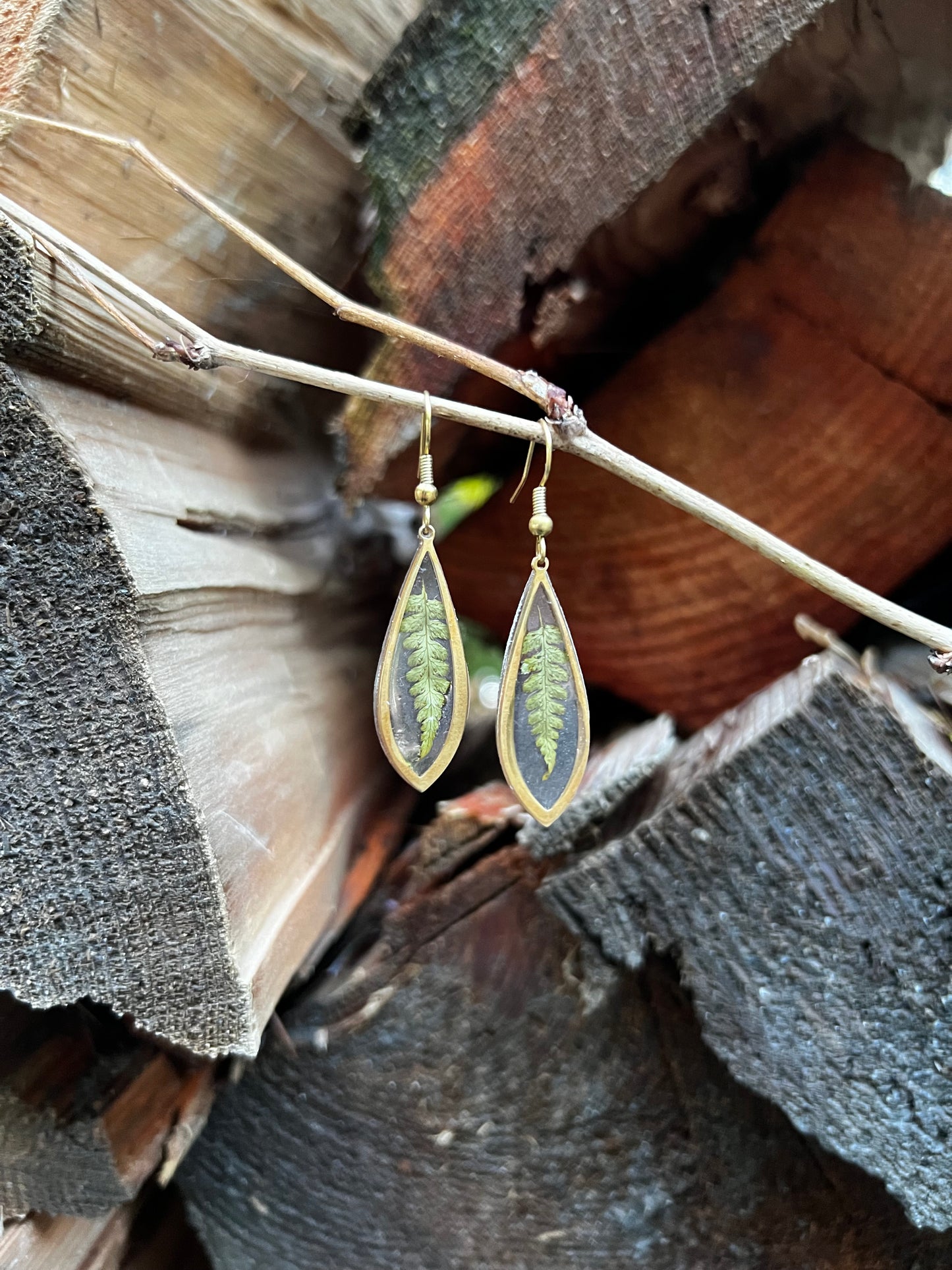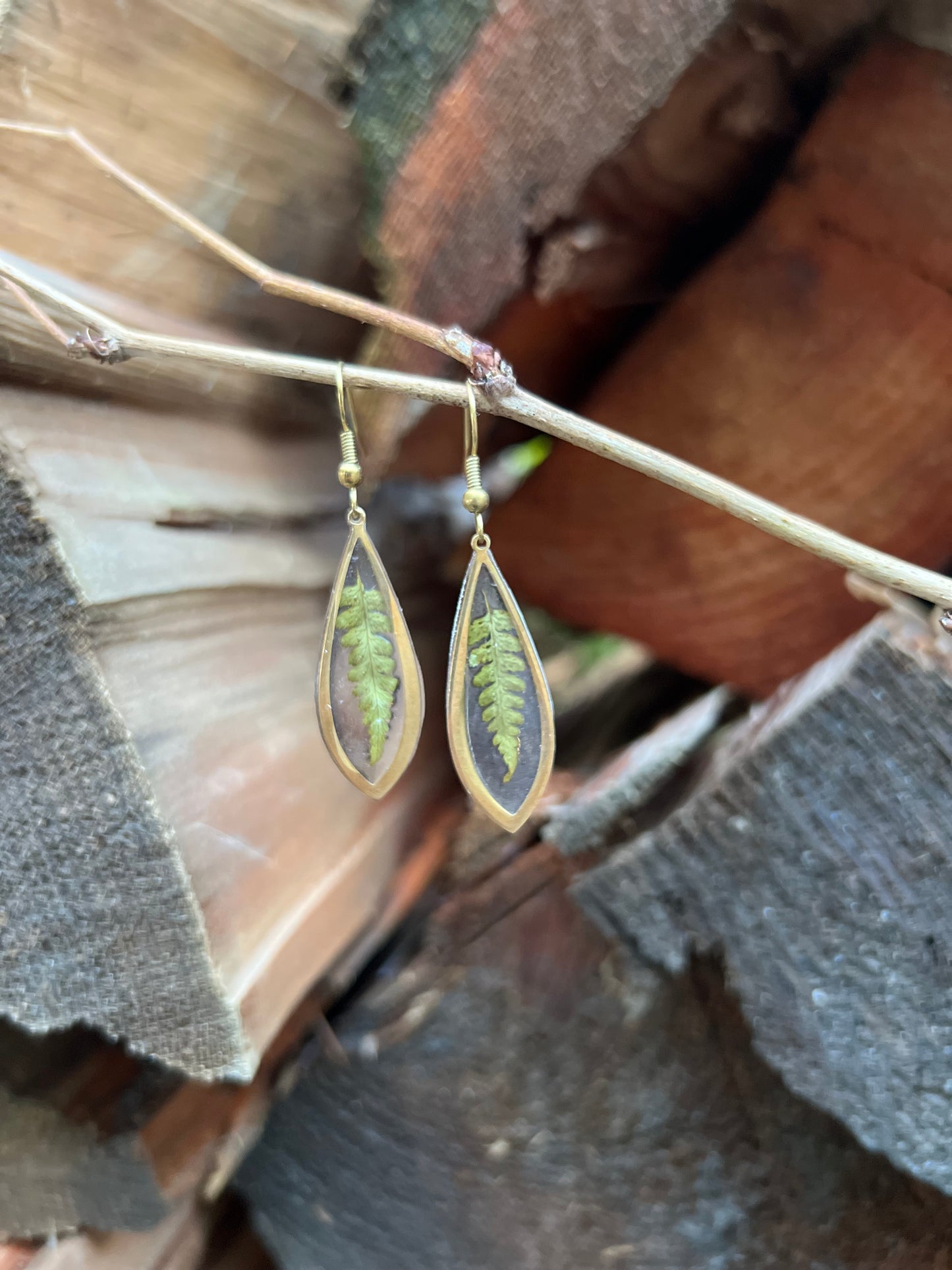 Teardrop shaped earrings with oak ferns handpicked in Southeast Alaska. The metal is all bronze in color and hypoallergenic/nickel free.