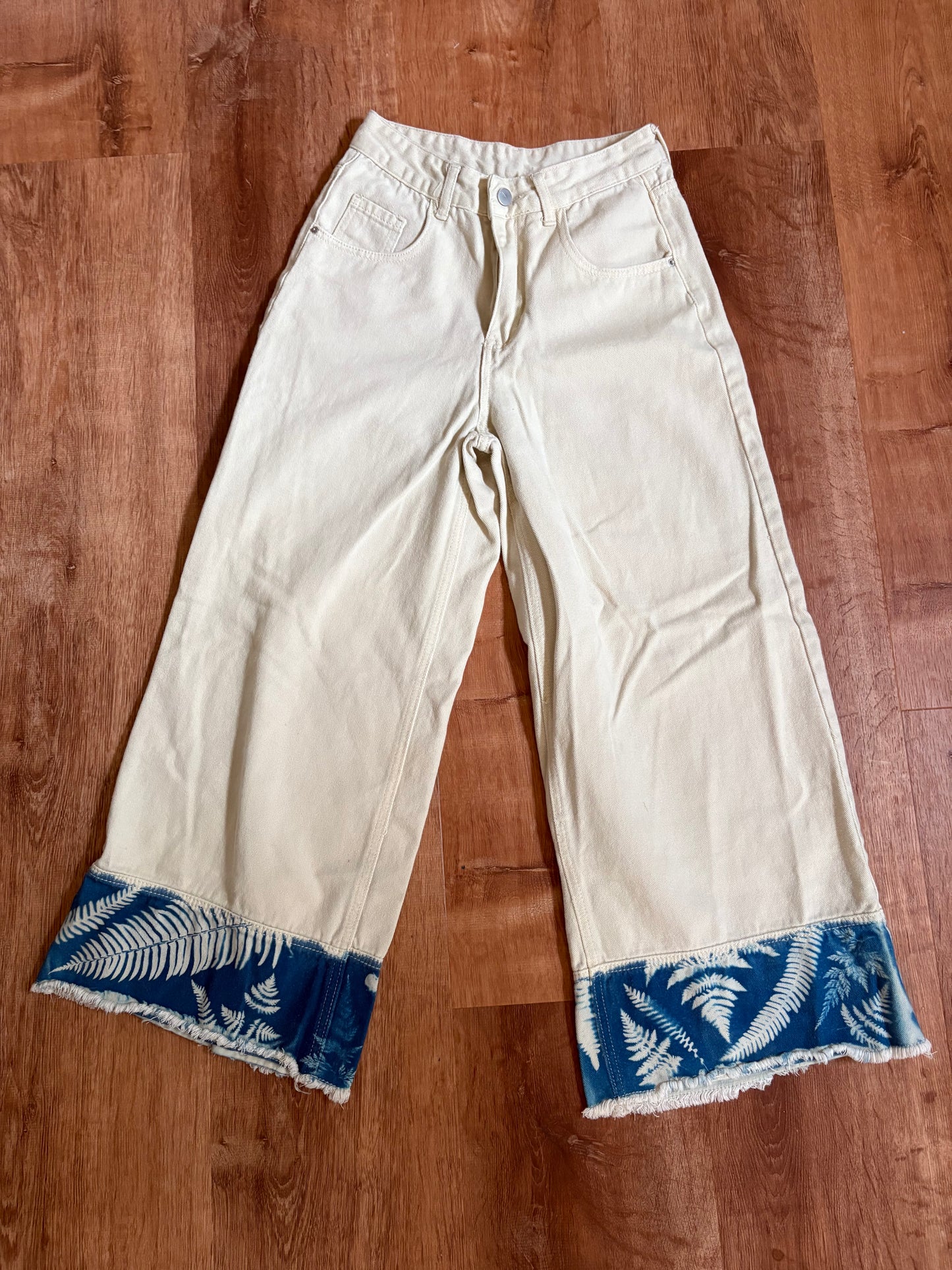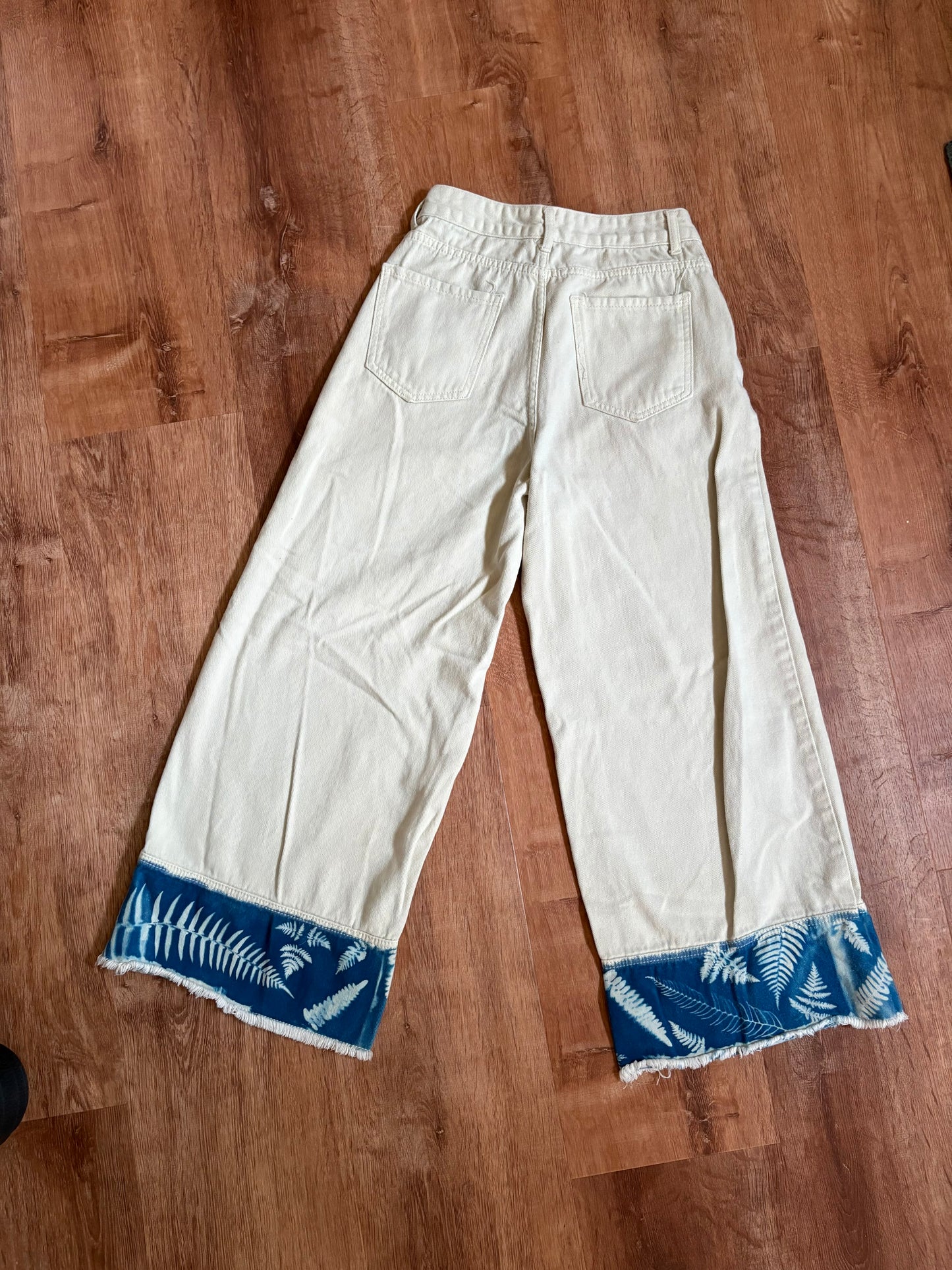 White wide legged high waisted pant. Unknown brand, unknown exact size but fits like a 27 or a 4 or a small.